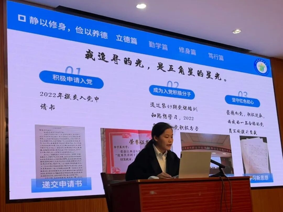 她坚定正确的政治方向,积极向党组织靠拢。2022年9月刚入学,她就向党组织递交了入党申请书,参加了学校第25期业余团校和第49、50期业余党校培训,现已是一名中共预备党员。作为班级团支书,她精心组织并开展了20余场主题团日活动和主题团课。借助参与“微团课”“喜迎二十大,奋进新征程”演讲比赛以及“三下乡”等活动,她不断深化对党的认识,将专业发展与人生选择紧密结合,将个人成长融入集体奋斗。在她的努力下,班级凝聚力和战斗力显著增强,同学们在思想上更加成熟,行动上更加自觉。