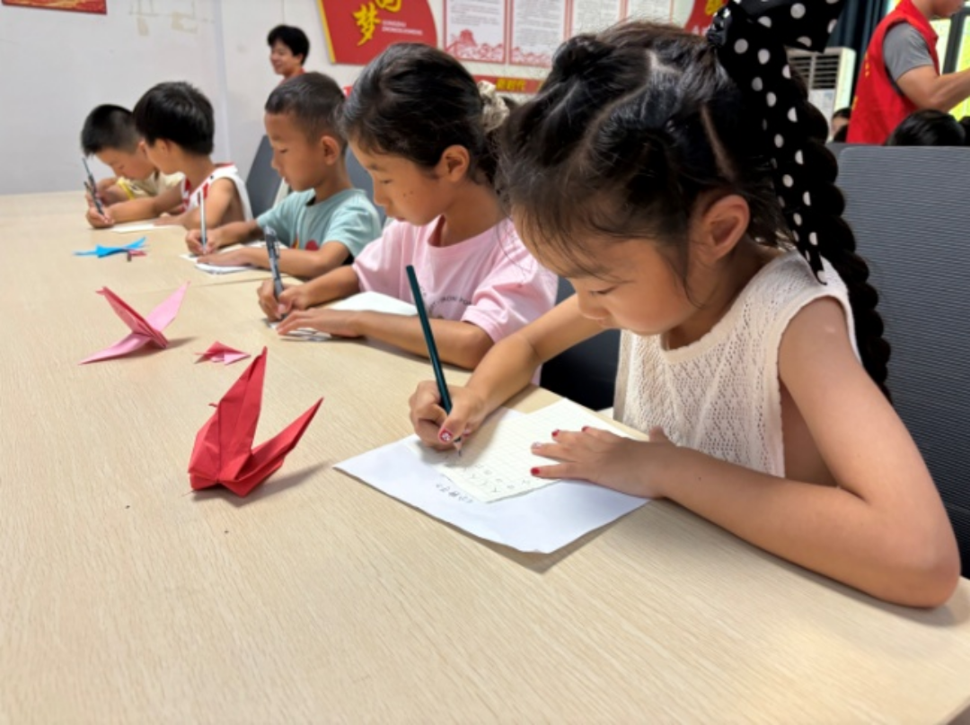 本次社会实践活动是传统文化与现代知识交织成生动的育人图景:剪纸体验区里,孩子们灵巧的指尖翻飞,将彩纸化作栩栩如生的花鸟鱼虫,在对称纹样与自由创作中感受非遗魅力;书法课堂上,实践团成员手把手纠正坐姿握笔,从“横平竖直”的基础笔画学起,带领孩子们领略汉字刚柔并济之美;“你划我猜”游戏中,孩子们默契配合、创意迸发,在欢声笑语中培养团队协作精神;反诈科普环节则通过情景模拟与互动问答,将防骗知识转化为朗朗上口的安全口诀,为暑期生活筑牢防网。