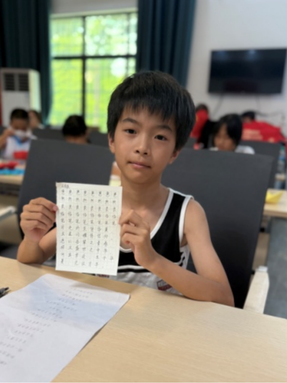 为传承中华书法文化,夯实乡村儿童书写基础,实践团开展书法基础教学课。通过“理论示范+实践指导”的教学模式,20名儿童从坐姿、握笔等基础规范学起,开启传统文化浸润之旅。教学现场,实践团孔晶化身“书写引路人”,将专业知识转化为趣味课堂。从“头正、身直、臂开、足安”的标准坐姿示范,到“拇指食指捏,中指托,无名指小指往里藏”的握笔口诀教学,她通过生动的动作分解与现场演示,帮助孩子们快速掌握书写要领。 在书写实践环节,实践团采用“一对一”精准指导模式,穿梭于课桌间细心观察。发现有孩子弯腰驼背时,轻拍肩膀温馨提醒;遇到握笔姿势偏移的情况,则耐心示范正确手势,并形象比喻“握笔就像握小拳头,既有力又灵活”。在实践团的引导下,孩子们逐渐掌握了运笔力度,田字格纸上的“人”“口”“日”等汉字虽显稚嫩,却工整有力。