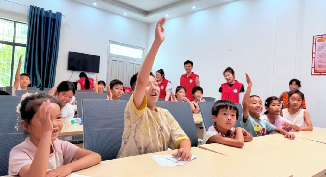 在实践团队员的示范带动下,孩子们纷纷化身“小戏骨”踊跃登台。石雨辰小朋友抽到“举手回答问题”后,立刻挺直腰板作沉思状,突然眼睛一亮,“唰”地举起手臂左右摇晃,活灵活现的表演让围观小伙伴笑作一团,现场气氛瞬间推向高潮。这场寓教于乐的互动游戏,不仅锻炼了孩子们的观察力和反应力,更在轻松氛围中拉近了彼此距离,成为孩子们记忆中难忘的欢乐时光。
