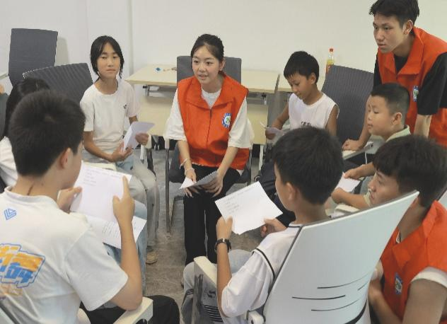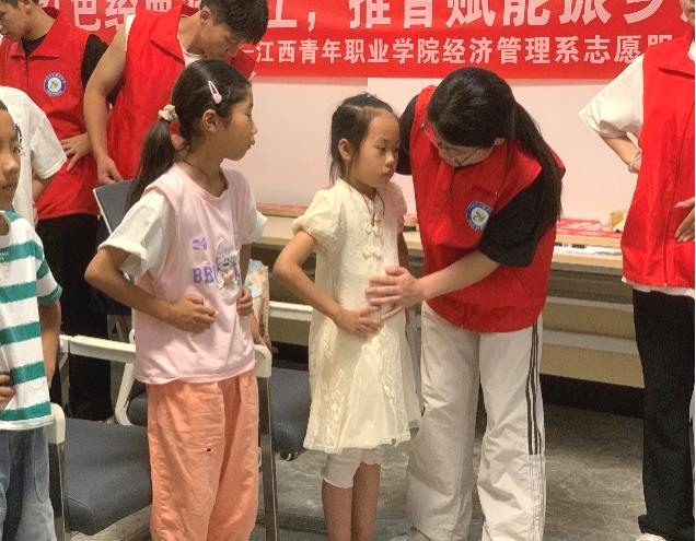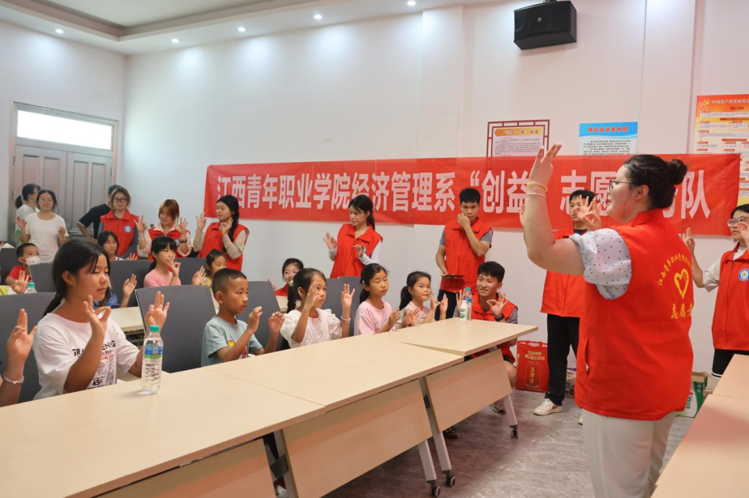 在庐山市芙蓉村“童心港湾”活动现场,“星火筑梦,青春力行”社会实践服务队组织乡村儿童学唱经典红歌《歌唱祖国》,以童声传唱培育爱国情感;开展抢凳子、击鼓传花等趣味游戏,在寓教于乐中提升孩子们的反应能力与合作意识,以实际行动推动乡村儿童教育走深走实。“创益”志愿服务队聚焦乡村教育与儿童关怀,以知识为舟、趣味为桨,带来精彩纷呈的科普课堂,通过心迹绘语、互动小游戏等形式传递温暖,“原来科学这么有趣!”孩子们的兴奋分享,让科学的种子在心中悄然生根。