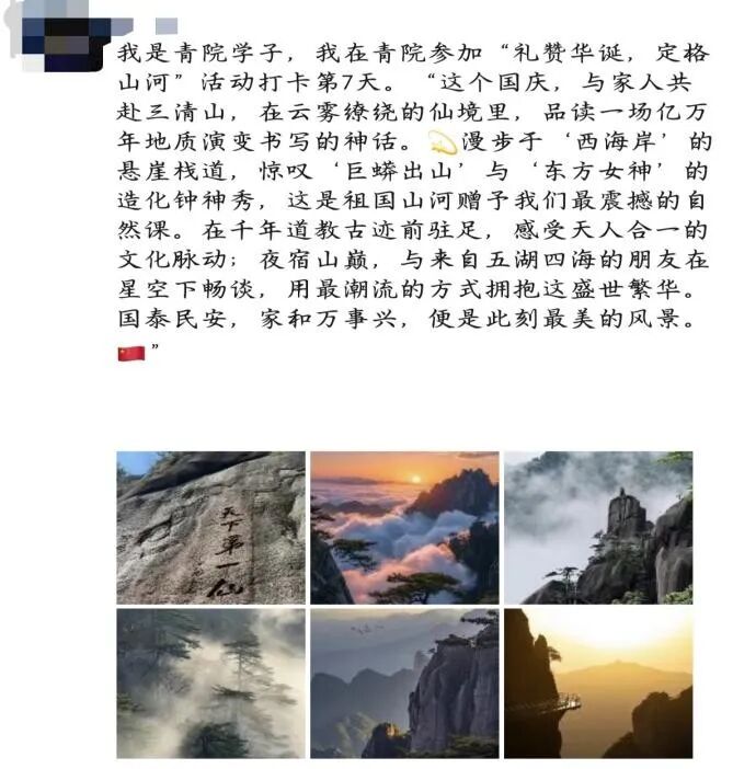 国庆佳节,清风送爽。青院学子与家人挚友相伴,循着山河脉络奔赴远方。他们以镜头为笔,将层叠的远山、灿烂的烟花都纳入取景框,每一幅影像,都是对祖国最真挚的致敬,藏着对这片土地最深沉的热爱与祝福。