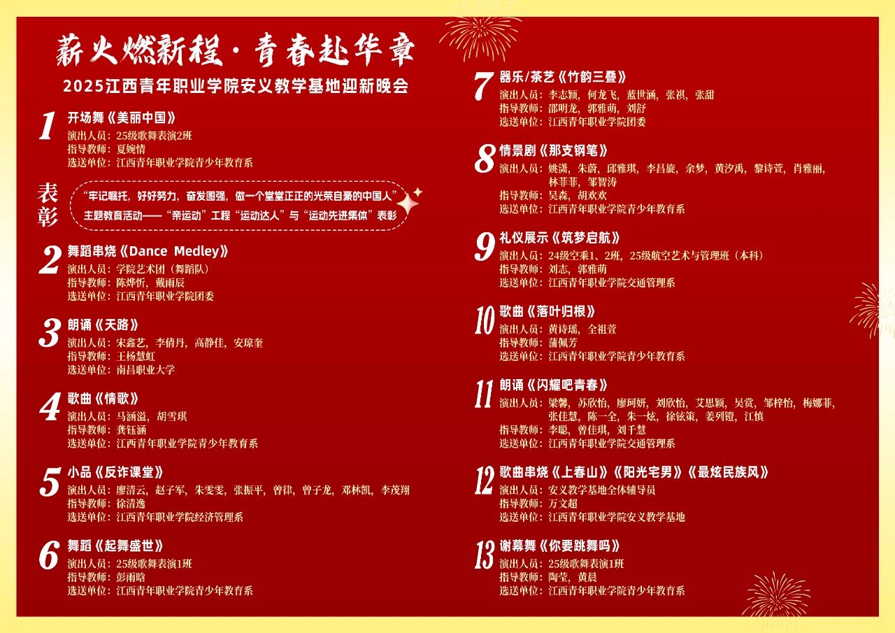 青春不设限,狂欢正当时!2025 江西青年职业学院安义教学基地“薪火燃新程・青春赴华章”迎新晚会将于 11 月 18 日(明晚)18:30重磅来袭!13个爆款节目轮番上阵,解锁青春多元打开方式!