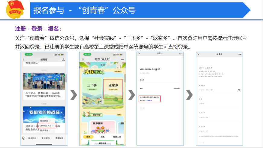方式二:关注家乡所在地的省、地市、县区的团组织微信公众号,阅读“返家乡”相关推文,按要求报名参加。