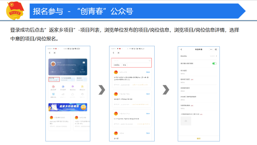 方式一:关注“创青春”微信公众号,选择社会实践登录(未注册的先注册账号)-点击返家乡项目-完善简历信息-选择合适岗位报名(按分类、区域搜索岗位信息,选择合适岗位报名并提交)-主动联系实践单位争取被录用。