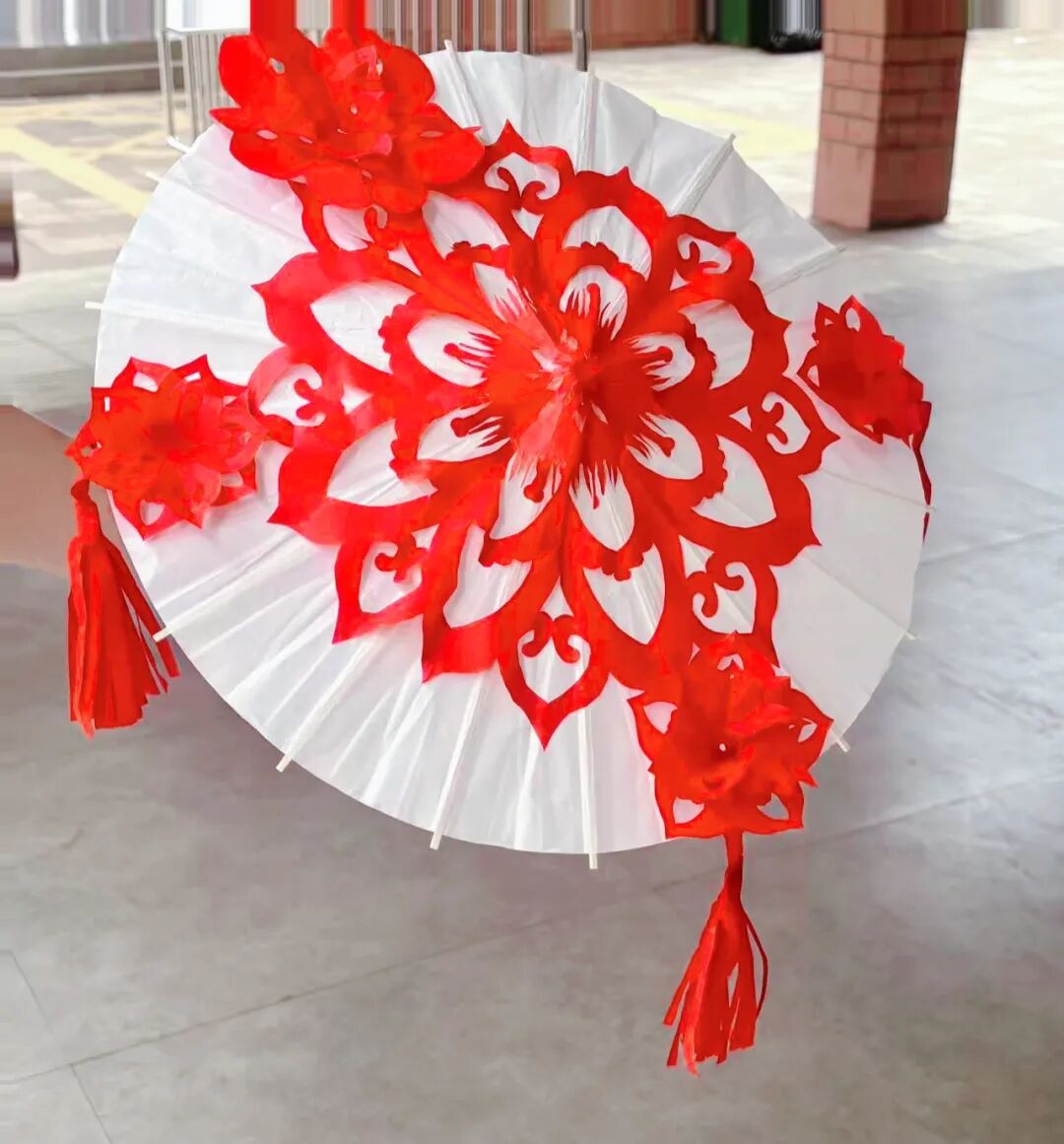 在作品展示现场,数十把素洁油纸伞有序陈列,素白伞面与艳红剪纸相映成趣。参展作品风格多元,处处彰显巧思:蝶舞花间主题伞上,灵动蝴蝶穿梭于繁花盛景之间,剪纸线条细腻婉转、流畅自然,仿佛蝶翼轻颤,花香似在伞间萦绕;对称团花作品,以精湛镂空技艺雕琢出层层叠叠的精美纹样,搭配立体纸艺花饰与雅致流苏,将中式美学的对称精致、典雅大气展现得淋漓尽致;饱含美好期许的“年年有余”“吉祥如意”等传统纹样,与油纸伞完美相融,每一道纹路、每一处细节,都承载着中华传统民俗的美好寓意。